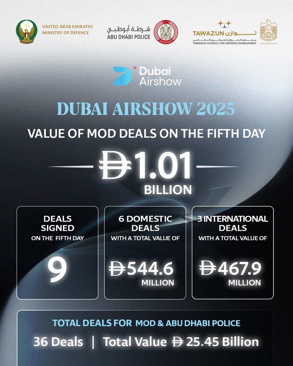 The Tawazun Council for Defence Enablement recorded nine new contracts worth AED 1.012 billion on behalf of the Ministry of Defence on the fifth and final day of the Dubai Airshow 2025, elevating the event's five-day total to 36 agreements with a cumulative value of AED 25.455 billion.