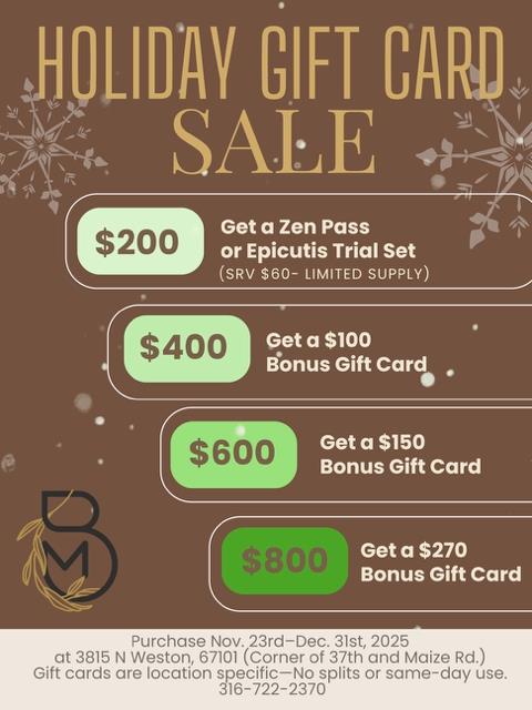 The holiday gift card promotion ends December 31, 2025. Appointments can be scheduled online or by calling 316-722-2370.