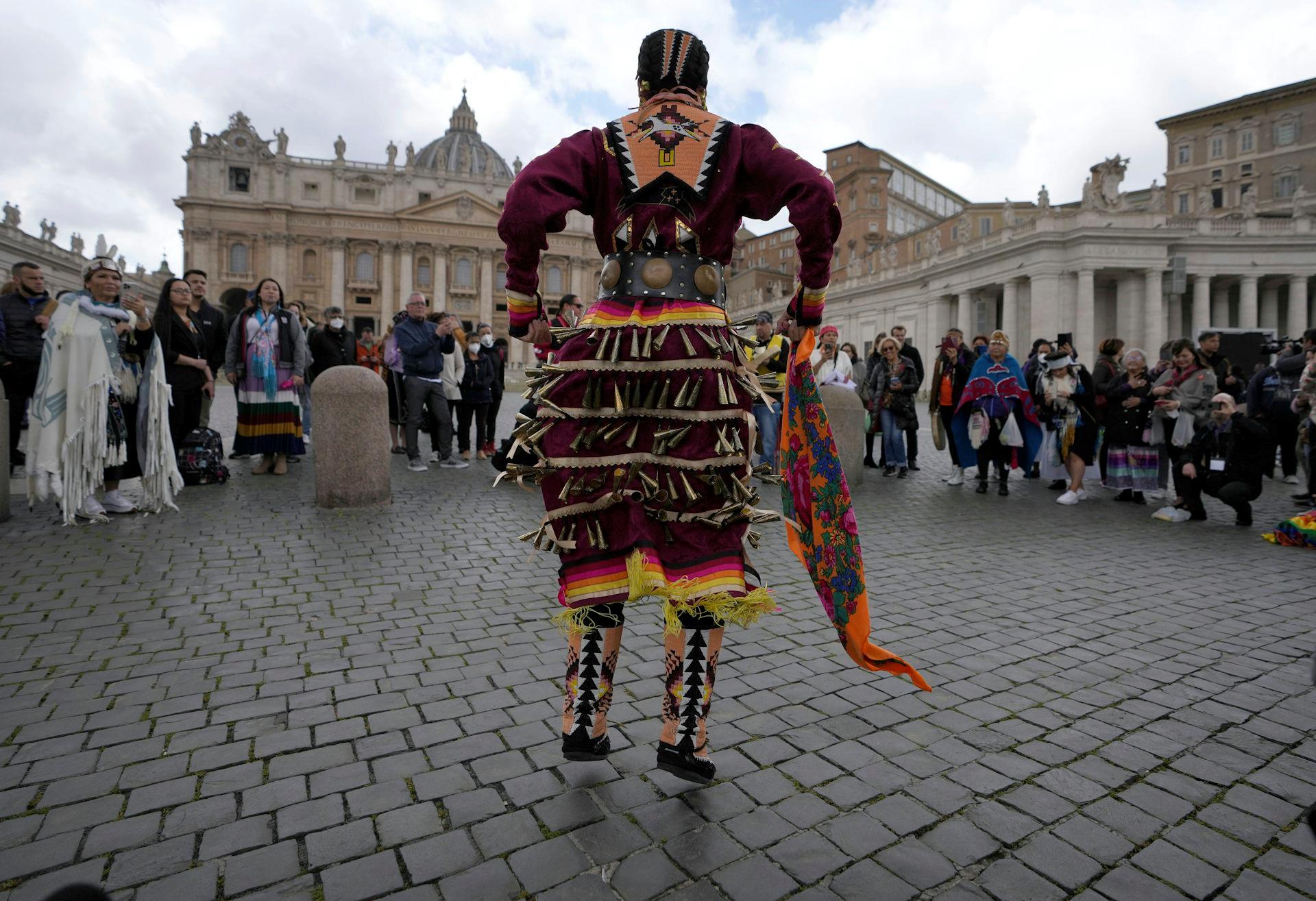 A dancer in St. Peter's Square at the Vatican in April 2022 during a visit of First Nations, Métis and Inuit delegates to Rome to meet with the late Pope Francis on calls for a papal apology for residential schools. (AP Photo/Alessandra Tarantino) Culture of conquest