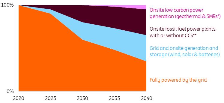 Note: *SMR technology development till 2035, actual generation from 2035 onwards. **CCS = emission reduction by capturing and permanently storing CO2 emissions. Source: ING Research based on Gartner.