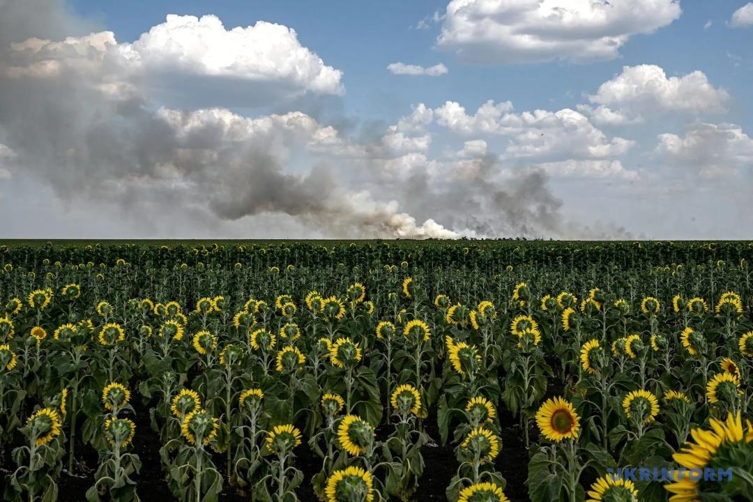 Smolienko's photo captures smoke rising over a sunflower field in Zaporizhzhia region on June 8, following a Russian attack.