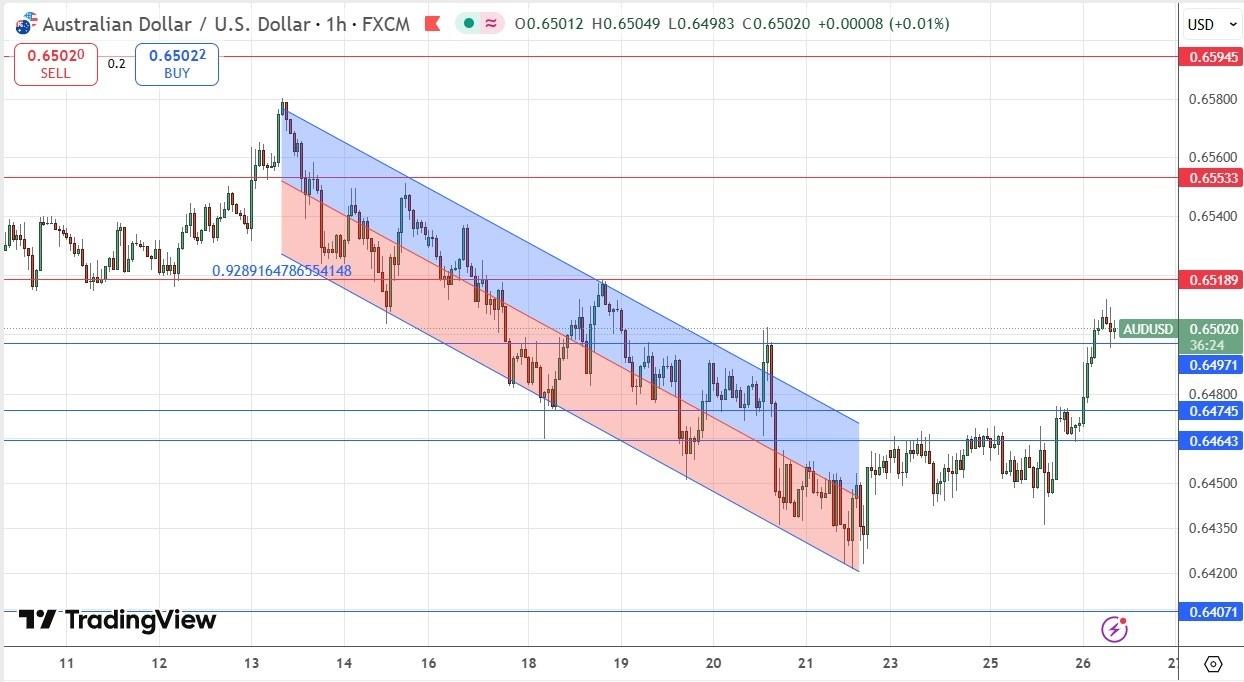 - Long entry following a bullish price action reversal on the H1 time frame immediately upon the next touch of $0.6497, $0.6475, or $0.6464. Put the stop loss 1 pip below the local swing low. Adjust the stop loss to break even once the trade is 20 pips in profit. Take off 50% of the position as profit when the price reaches 20 pips in profit and leave the remainder of the position to run.