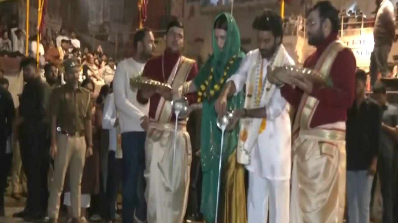 Ahead of the release of their upcoming film 'Tere Ishk Mein', actor Dhanush and actress Kriti Sanon performed the Ganga Aarti at Dashashwamedh Ghat in Varanasi, drawing a massive gathering of fans who turned their visit into a festive spectacle.