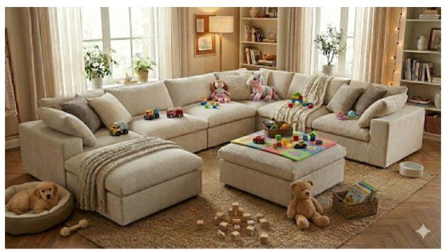 This is for the "movie night" crew. Soft, textured corduroy is trending heavily in 2024/2025 interior design. It offers massive seating capacity and turns into a giant "pit" bed that kids and adults love for sleepovers. Soft corduroy texture, massive U-shaped layout, double ottoman sleeper function.