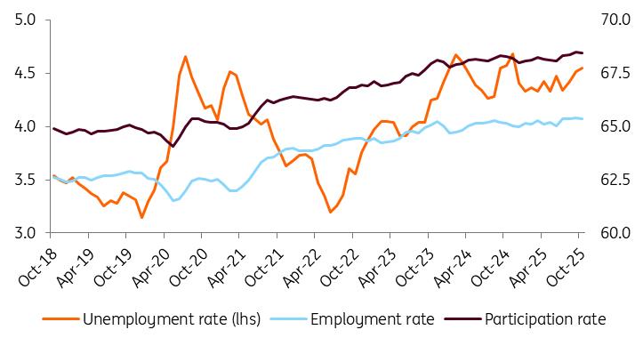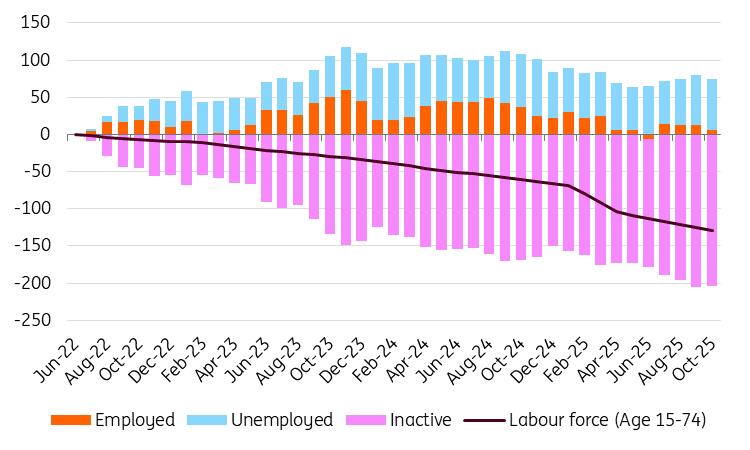 To the details, then, and the monthly data shows that the decline in the working-age population continues. At the same time, however, the number of employed has also increased, albeit within the margin of statistical error. This increase was driven by those entering the labour market, while the number of unemployed people decreased by a minimal amount each month. The October indicators are consistent with the seasonal pattern observed in previous years and do not suggest any structural change.
