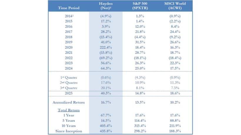 We gained +20.1% in Q3, outperforming the S&P 500's +8.1% and MSCI World's +7.5%. Since inception, we've returned +16.7% annualized after fees, ahead of the S&P 500's +13.5% and MSCI World's +10.2%.