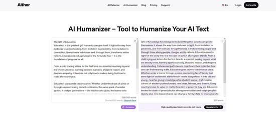 AI Humanizer interface screenshot showing Aithor's tool that transforms robotic AI-generated content into natural, human-like writing.