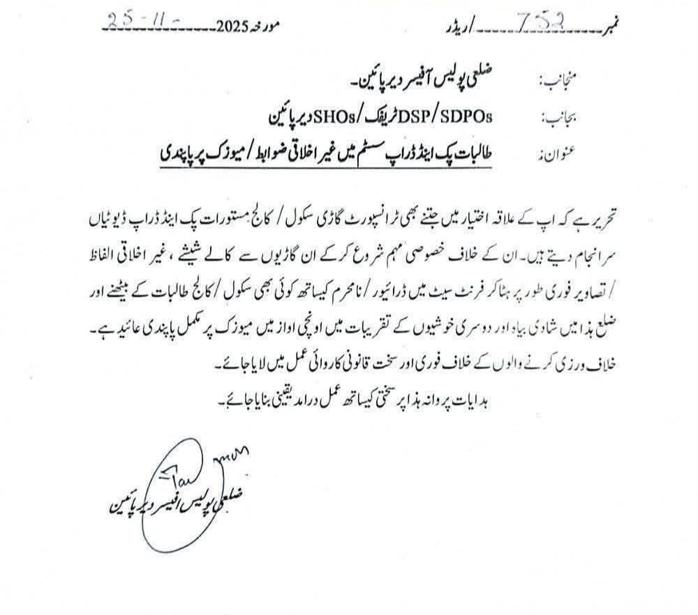 The circular, issued on 25 November by the DPO of Lower Dir (Dir Paeen), directed DSPs, SDPOs and SHOs to launch a special campaign against transport vehicles providing pick-and-drop services to women. The order instructed police to remove black-tinted windows,“immoral” stickers and images, and to strictly enforce a ban on school and college girls sitting in the front seat with male drivers.