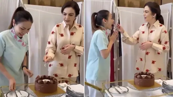 Nita clapped as other staffers sang "Happy Birthday" to the staff member in a mint green uniform. Nita, dressed in a beige and red co-ord set, watched gracefully as her staffer cut the birthday cake, then took a spoon and fed her a small piece.