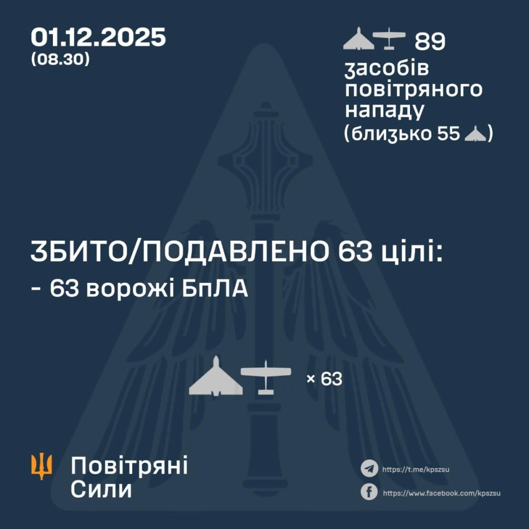 According to preliminary data, as of 8:30 a.m. on Monday, December 1, Air Defense Forces shot down/jammed 63 UAVs in the north, south, and east of the country.