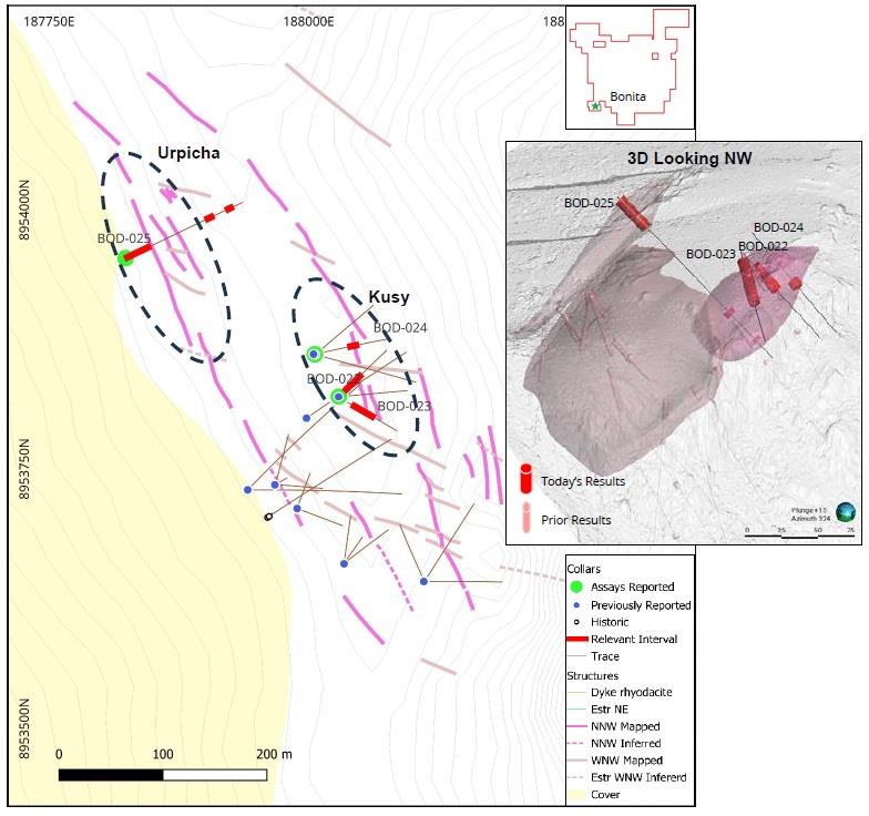 Note: Reported intervals are apparent widths as the full geometry of the mineralized structures has not yet been fully modelled. Assays were not capped, and composite intervals are calculated using a minimum weighted average of 0.5 g/t Au, over a minimum core length of 2m, allowing internal dilution.