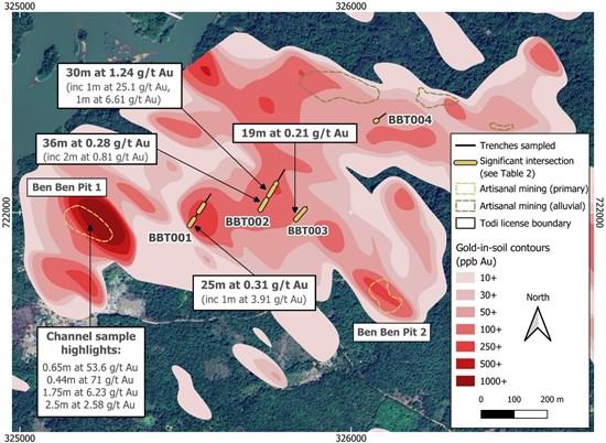 Previous channel sampling from the main artisanal pit at Ben Ben (Pit 1 on Map 2) returned high-grade results up to 71 g/t Au, underscoring the strong potential of the target area. Selected results are shown below:
