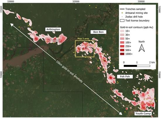 Ben Ben is interpreted as the southeastern extension of the Arthington Discovery (Map 1), where 6,836m of drilling by Zodiac Gold has encountered significant mineralization in 37 of 39 drill holes. Highlighted intercepts from Arthington include: