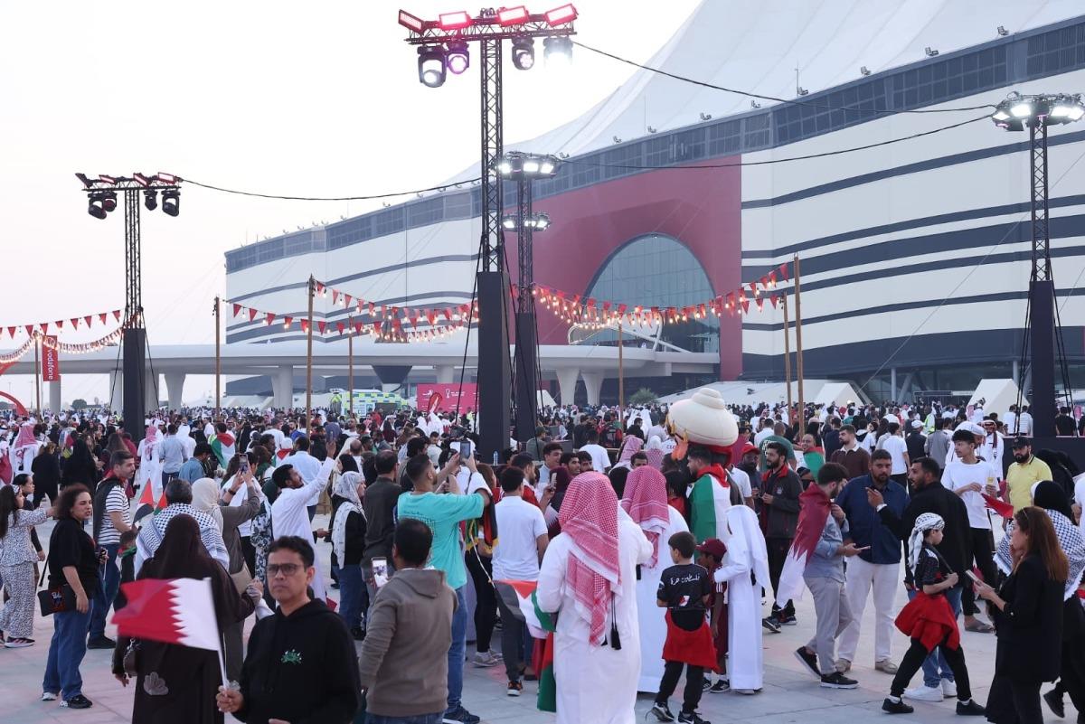 Fan vibes at Al Bayt Stadium ahead of the Qatar versus Palestine match.