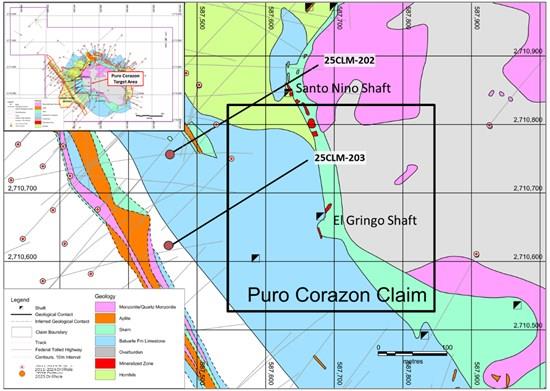 Assays from drill hole 25CLM-202 were also received and identified mineralized skarn located adjacent to the historic Santo Nino workings which are located to the north of the Puro Corazon claim boundary and on the larger CLM property. Highlights include: