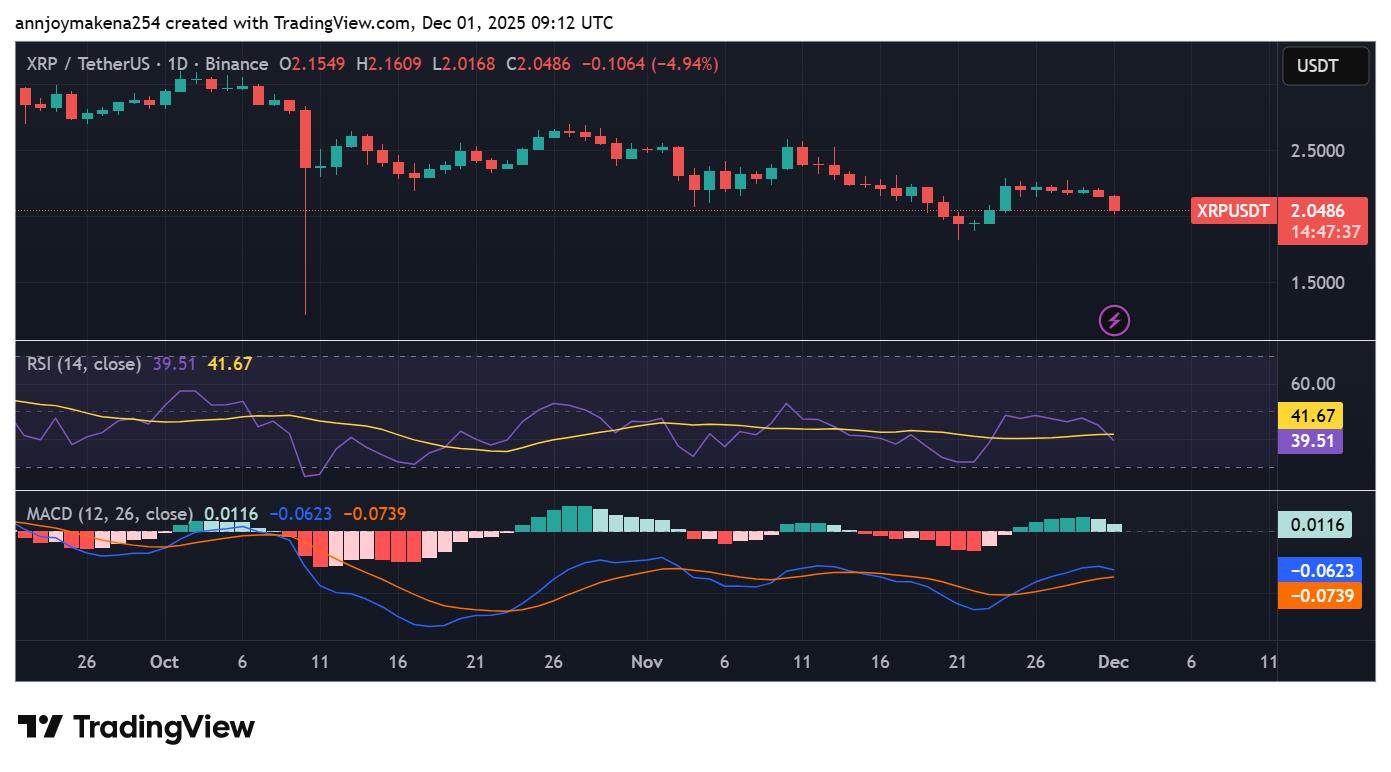 Trading volume jumped 57%, suggesting heightened activity as traders assess whether XRP is nearing oversold territory. Indicators show cautious sentiment. The Relative Strength Index hovers around 39–41, signaling fading buying pressure. Meanwhile, the MACD remains in bearish territory, with the signal line above the MACD line and momentum trending lower.