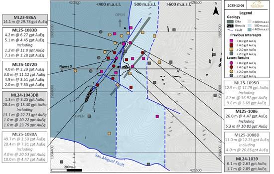 Figure 2: Plan view of Media Luna West showing high-grade drilling intercepts over different structural blocks at distinct elevations. Mineralization remains open to the north along the main north-south corridor and to the south towards the San Miguel fault.