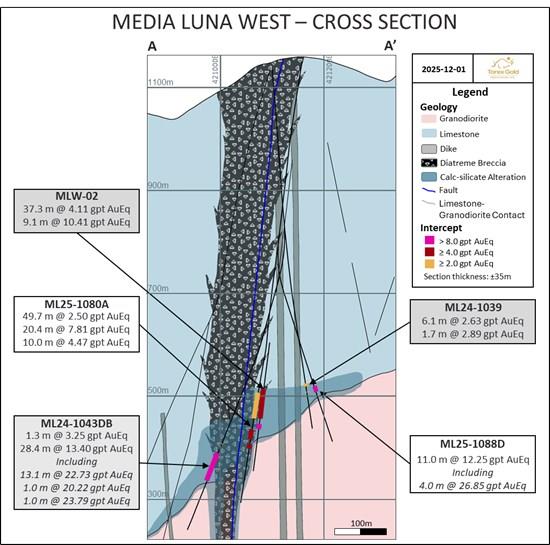 3) The gold equivalent grade calculation used is as follows: AuEq = Au (gpt) + (Ag (gpt) * 0.0127) + (Cu (%) * 1.6104) and use the same metal prices ($1,650/oz Au, $22/oz Ag, and $3.75/lb Cu) and metallurgical recoveries (90% Au, 86% Ag, and 93% Cu) used in the year-end 2024 mineral resource estimate for Media Luna.