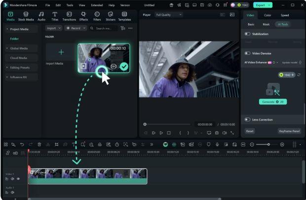 If your device has a GPU, the enhancement runs locally and handles long videos efficiently. Otherwise, Filmora V15 automatically uses cloud processing for stable performance. Simply import your clip, apply AI Video Enhancer, and preview the improvements. This tool saves significant editing time while keeping footage natural, sharp, and visually appealing.