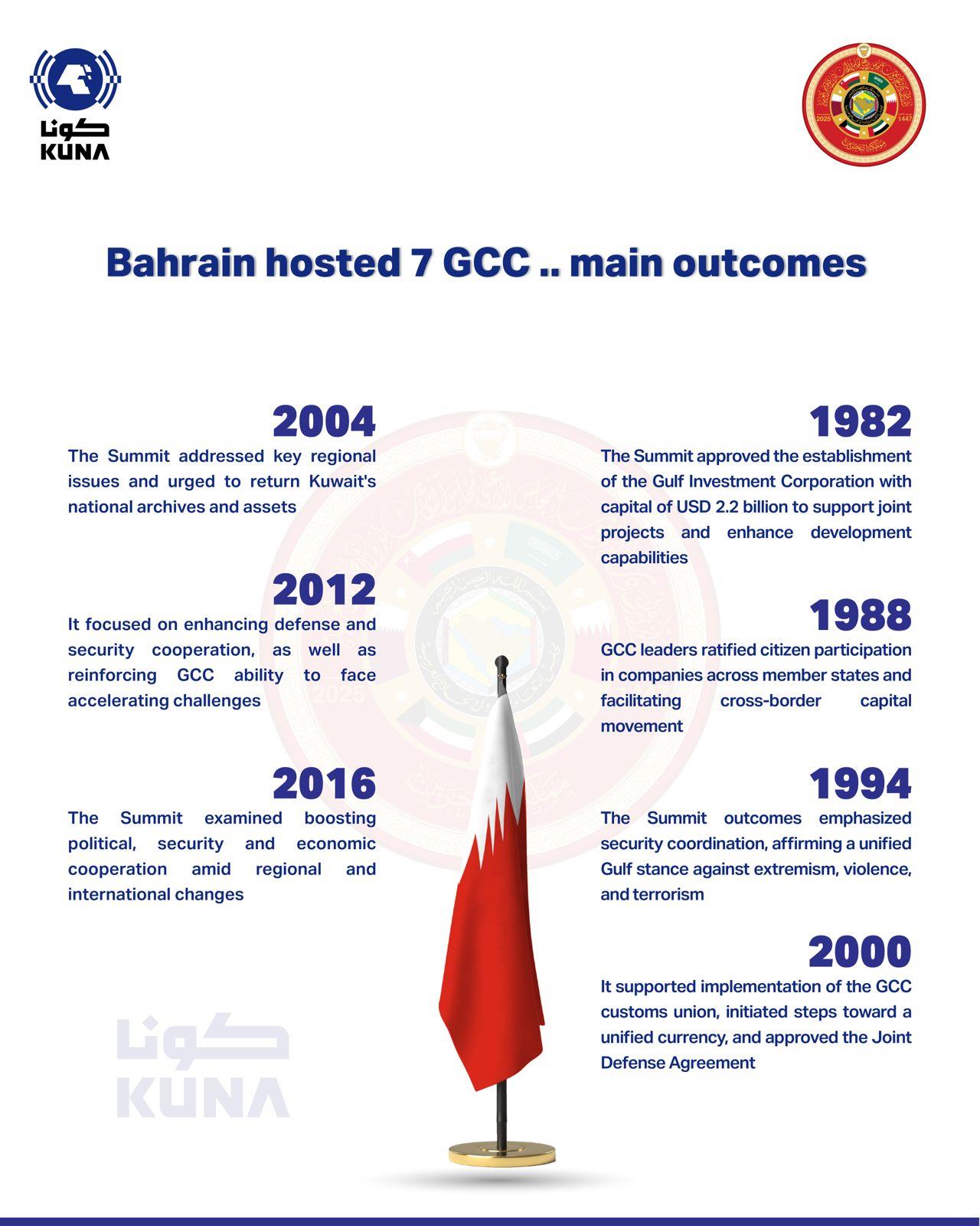 MANAMA, Dec 2 (KUNA) -- Over decades, Bahrain has hosted seven GCC summits that marked major milestones in strengthening political, economic, and security integration among member states and advancing joint Gulf action.