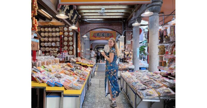 Jana Alessa Bittner explores Dihua Street in vintage-style dress, immersing herself in Taipei's historic atmosphere.