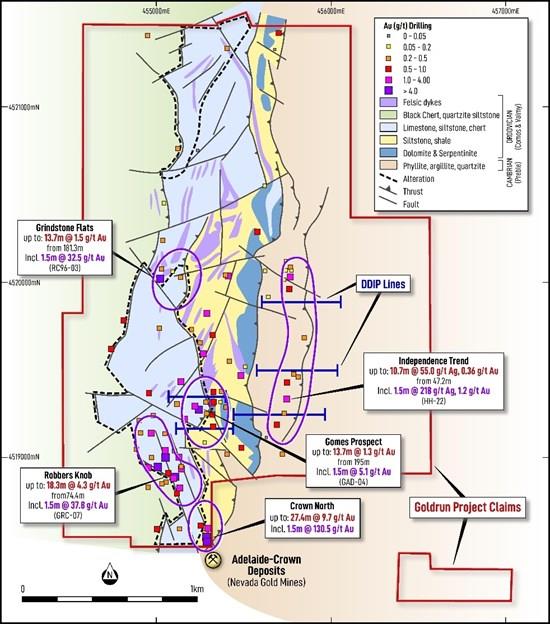 - Strong gold-, silver- and arsenic-in-soil geochemistry possibly indicative of epithermal style which is significant given the Adelaide Crown deposits are located directly along strike to the south approximately 600m away (Figure 4). Previous drilling intersected significant zones of gold and silver including up to 13.7m at 1.3 g/t Au* and 19.8m at 26.2 g/t Ag, 0.3g/t Au* both intersected in GAD-04 (Figure 2). The drilling focuses on targeting one very large and strong DDIP anomaly 200m wide located 140m along strike from significant intersections GAD-02 and GAD-04 (Figure 2). New drilling aims to target the large IP anomaly interpreted to be related to disseminated sulphide and associated gold-silver mineralisation along strike from previous drilling that could represent a new deposit.