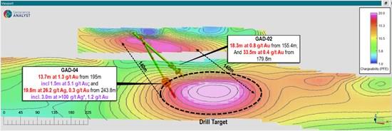 Figure 2: 3D view (looking north and down) of two DDIP Chargeability Sections at the Gomes Prospect that occur north and south of Drillholes GAD-02 & 04. Drill Target defined in dash-black circle.