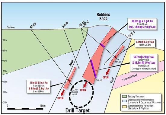 Figure 3: Cross Section at Robbers Knob illustrating example of drill-ready target defined in dash-black circle.