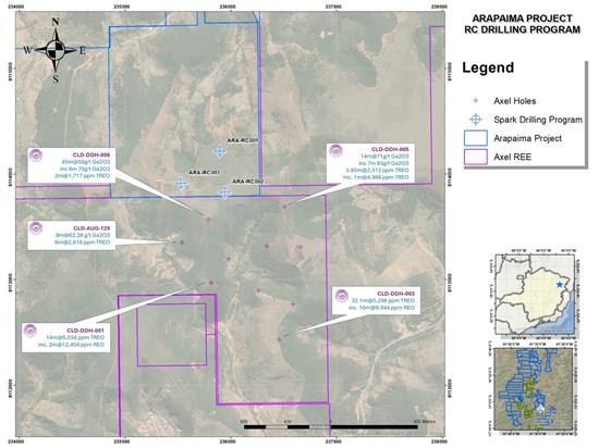 Figure 1. Planned Spark drill locations situated immediately north of Axel REE's Caladão Project "Area A," where Axel has reported a JORC 2012 Inferred Mineral Resource of 233 Mt @ 2,133 ppm TREO and 100 Mt @ 42 ppm gallium. Spark's maiden RC program is designed to test whether this REE-gallium system extends southward onto the Arapaima Project.