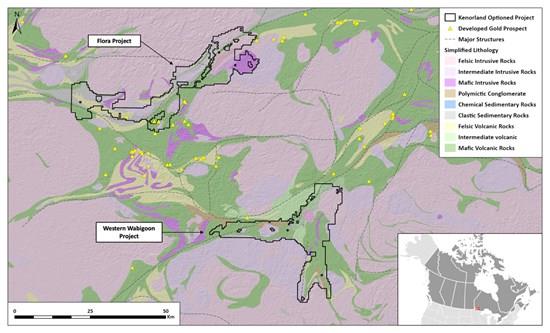 Figure 1. Regional geology of the Western Wabigoon subprovince with Western Wabigoon and Flora Project locations
