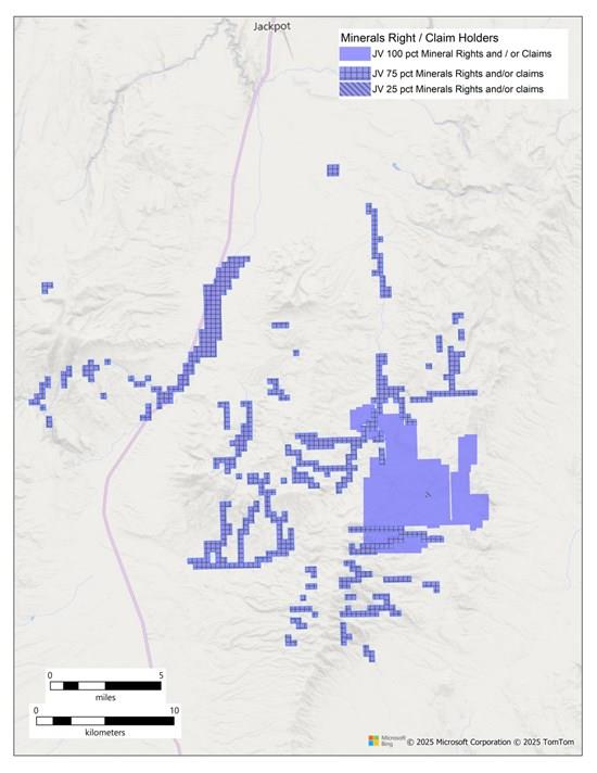 Pursuant to the Contribution Agreement, Surge US has contributed to the JV all of its mining claims and mineral rights that comprise the NNLP. Evolution has contributed its 75% mineral interest in the 880-acre private land portion within the NNLP. These mineral interests were part of the Preliminary Economic Assessment recently announced by Surge. In addition, Evolution will contribute its 75% mineral rights in over 21,000 acres of private land in and around the NNLP. Maps of the mineral rights and claims of the JV are set out in figures 1 and 2 below.
