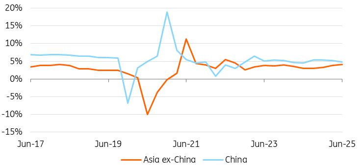 Looking ahead to 2026, we expect GDP growth (excluding China) to slow to 3.4%, down from 4% in the first half of 2025 and 3.6% for the full year. Large fiscal stimulus packages in Japan and South Korea are expected to offset the drag from weaker export growth, making these economies outliers with accelerating growth. In contrast, India and China – the region's other two largest economies – are forecast to experience cyclical slowdowns.