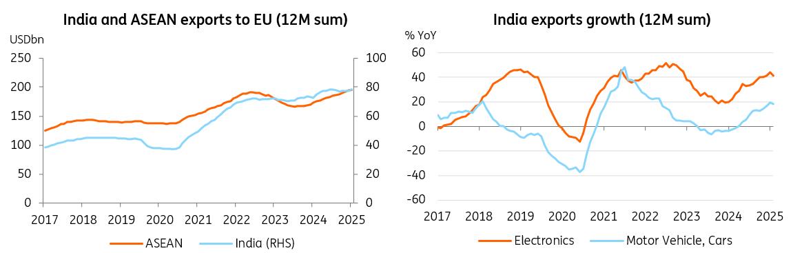 Tariff impact on export growth. While recent trade agreements signal a de-escalation in tensions, they offer limited assurance that export growth will remain robust. The full impact of tariffs on export growth is yet to be seen, as export growth remained rather resilient in 2025. Softer exports and weaker growth are likely to remain headwinds for several regional currencies.