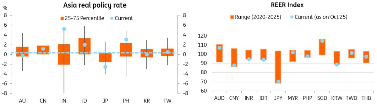 Valuation dynamics. Inflation differentials have become a more prominent driver of real effective exchange rates in the post-pandemic era, particularly for currencies such as the Chinese yuan, which have benefited from a sharp fall in mainland inflation. Over the year to September 2025, CNY's real effective exchange rate (REER) declined by 4.6%, while India and Indonesia saw even steeper declines of over 6.5%. The latest REER estimates (as of September 2025) suggest that the Chinese yuan, Korean won, Indian rupee, Japanese yen and Indonesian rupiah have the most room to appreciate, while the Singapore dollar, Malaysian ringgit, Taiwanese dollar and Thai baht appear to have limited upside, with REERs closer to fair value.