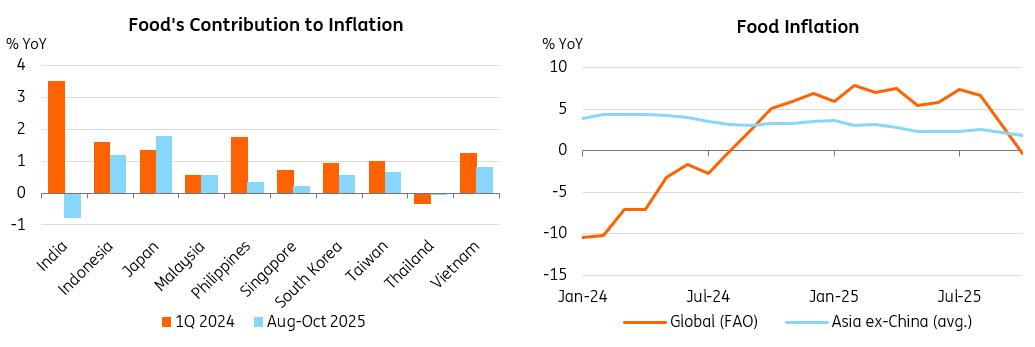 Asia saw a sharp slowdown in inflationary pressures in 2025, largely due to a significant drop in food's contribution to headline prices. Core inflation ticked up slightly across most economies, except Singapore, which recorded a steep decline of over two percentage points. Fuel prices remained contained but were not a major factor behind the overall inflation drop. The real story was food inflation, which eased substantially and now contributes less than 1% on average to headline CPI. For Asia, excluding China, food's contribution fell from 1.1% in December 2024 to just 0.4% by October 2025, with the sharpest declines in India and the Philippines.