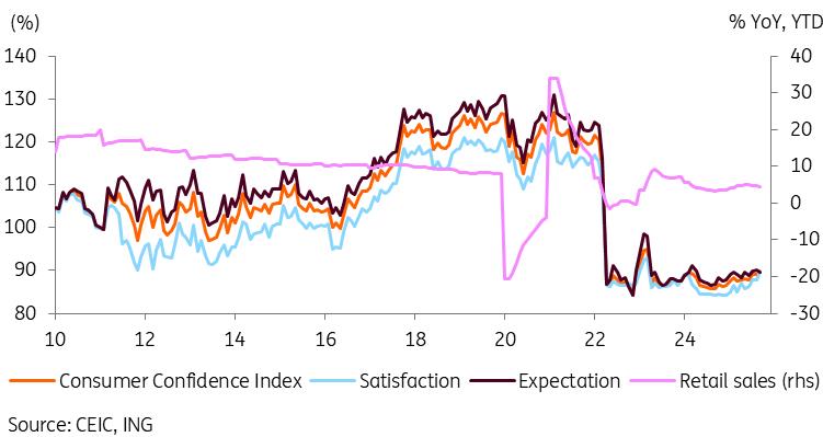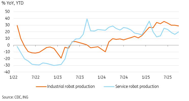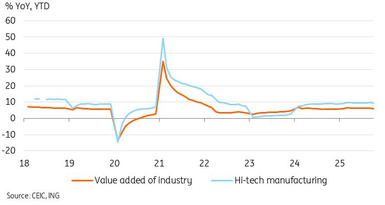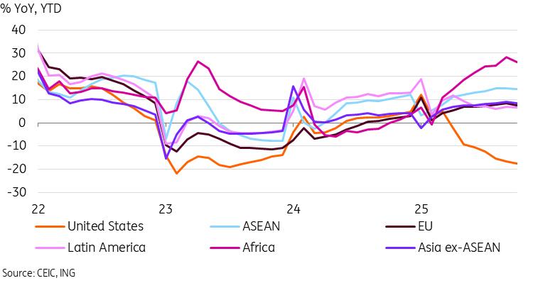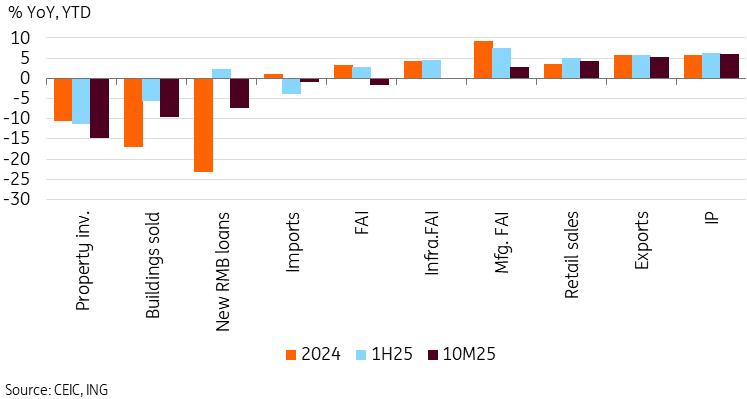 On China's trade with the US, markets breathed a sigh of relief after a one-year truce was agreed when Chinese President Xi Jinping and US President Donald Trump met in South Korea. However, it should be noted that the tariffs on China, currently at around 47%, remain well above the 20.7% level before Trump's inauguration. Combined with the front-loading of trade seen in the first quarter, it's likely that exports to the US will remain under pressure at least until the second quarter of 2026.