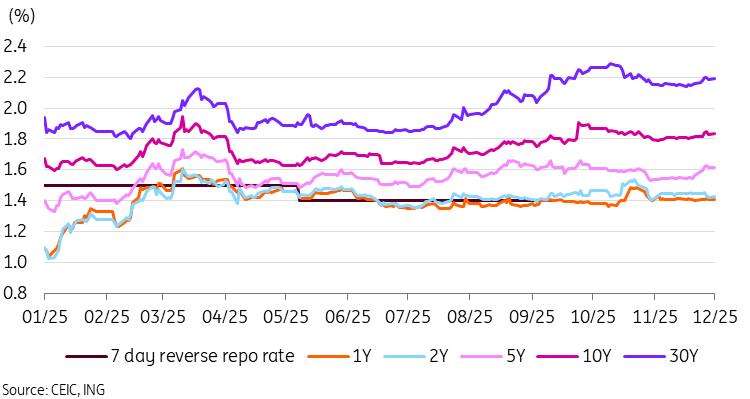 Our view on Chinese government bonds (CGBs) looks to be one of our more non-consensus calls for the 2026 outlook. At the time of writing, we seem to be the only house expecting an uptick in CGB yields next year. Markets are expecting 10-year yields to slide to 1.58% by the end of 2026, which would mark a new historical low, while we see room for yields to move higher to 2%.