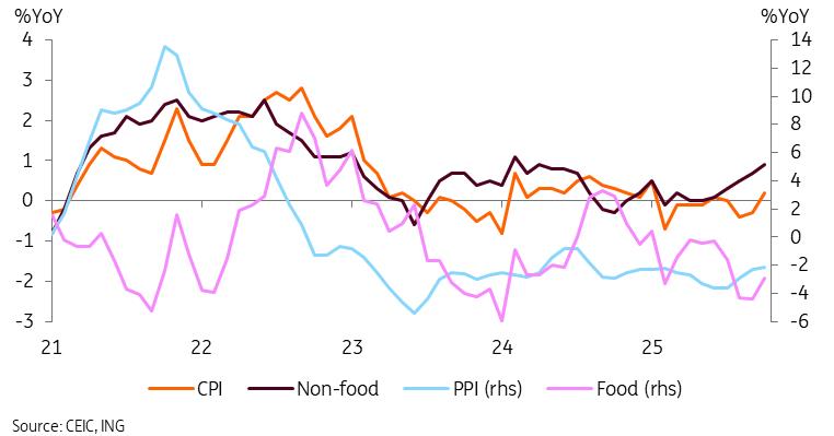 For 2026, we could see prices edge back into positive territory, at least for CPI inflation. Quietly amid deflation headlines, core CPI has trended upward for six straight months since May, recovering to 1.2% YoY by October. In the past few months, food prices have been the big drag. This is cyclical, and the worst of these pressures look likely to fade in the year ahead as the pork cycle turns. Our view is that CPI will recover to 0.9% YoY in 2026.