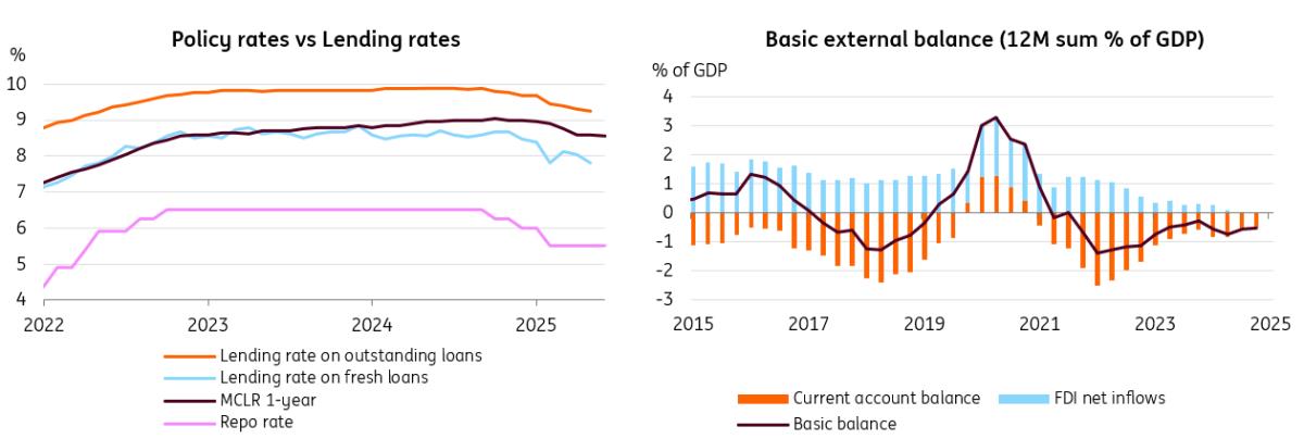 Stronger monetary policy transmission since the last RBI meeting: The easing cycle that began in February 2025 has gained traction. Banks steadily reduced repo-linked lending rates, while the marginal cost of funds-based lending rate (MCLR) – which typically adjusts more slowly – has also declined. Notably, the 1-year median MCLR for scheduled commercial banks has fallen by 45bp since February. In turn, the weighted-average lending rate on new rupee loans dropped by about 80bp, while rates on outstanding loans eased by roughly 60bp over the same period. The transmission of lending rates to the market has accelerated significantly since October, when the RBI held rates unchanged.