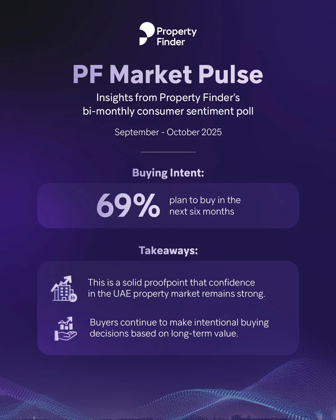 DUBAI, UNITED ARAB EMIRATES, December 2025: Property Finder, the MENA region's leading property platform, has released insights from its latest Market Pulse report covering September and October 2025. The consumer sentiment poll, reveals that home-buying intent remains robust, with 69% of respondents across the period planning to purchase a property within the next six months. The findings build on the steady momentum recorded in July and August, reaffirming that demand remains resilient even as sentiment around future pricing continues to experience slight variations. A closer look at price expectations reveals a subtle shift in sentiment: while only 40% of residents expect prices to fall, interest in property purchasing remains high. At the same time, 32% anticipate price increases and 29% foresee stability, showing that buyers are not waiting for significant market price drops to buy.. This combination of demand and measured price expectations signals the resilience of the UAE property market, where long-term confidence appears to outweigh short-term pricing concerns. If we further break down the data by month, 70% of respondents in September expressed an intention to buy within the next six months, followed by 68% in October. Even with a small dip between the two months, buyer interest is considerably high, and the larger October sample of 3,313 respondents compared to that of 2,987 in September, gave a richer view of buyer sentiment of the property market. Month-by-month price sentiment further validates this engagement. In September, 39% expected decreases, 33% anticipated increases, and 28% foresaw stability. By October, the numbers shifted slightly to 40%, 31%, and 29%, respectively. Rather than slowing market activity, these varied yet light expectations show that buyers are making measured decisions, balancing optimism with caution while remaining actively engaged. Cherif Sleiman, Chief Revenue Officer at Property Finder, said,“The latest Property Finder Market Pulse shows that UAE buyers are approaching the property market with thoughtfulness and confidence. Even as expectations around price shift modestly, they continue to move ahead with their plans, reflecting a market that values timing and affordability without waiting for extreme fluctuations. This sustained engagement signals not just resilience in short-term demand, but trust in the long-term stability of the UAE real estate sector, highlighting its attractiveness for residents and investors alike.” The Market Pulse strongly signals that the UAE property sector continues to combine sustained activity with informed decision-making, showing a market that is confident, deliberate, and poised for continued momentum.