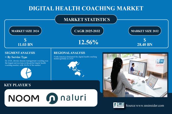 According to SNS Insider, the Digital Health Coaching Market size was valued at $11.03 billion in 2024 and is expected to reach $28.40 billion by 2032, growing at a CAGR of 12.56% over 2025-2032. This growth is driven by the rising prevalence of chronic diseases, rapid adoption of mobile-enabled coaching platforms, and the expanding use of artificial intelligence to deliver personalized behavioral guidance.