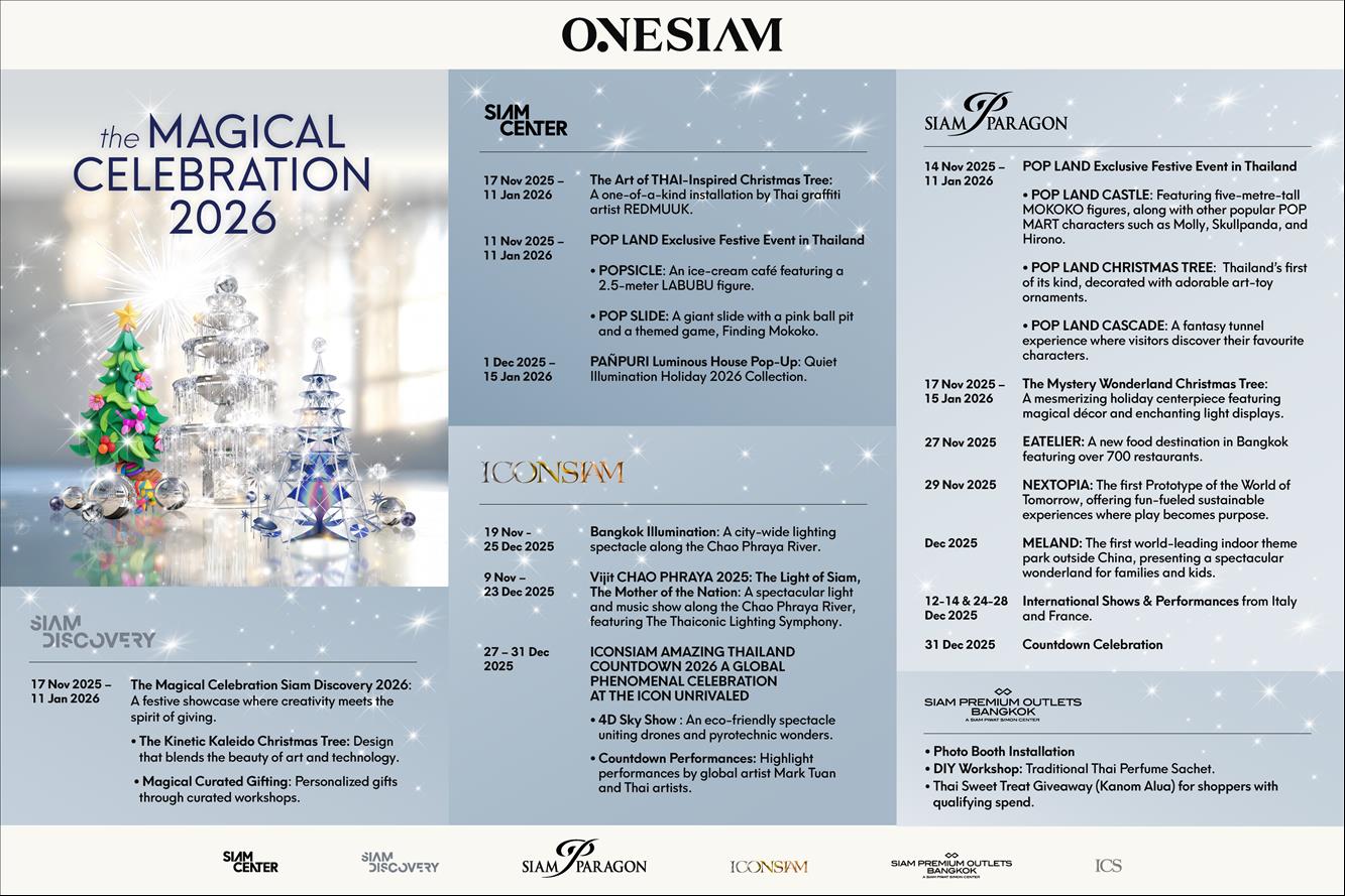 From creativity driven showcases at Siam Paragon and Siam Center to world class attractions at Siam Discovery, vibrant riverside spectacles at ICONSIAM, and festive shopping experiences at Siam Premium Outlets Bangkok, each destination presents its own interpretation of the season, together creating one unforgettable festive route for visitors of every age.
