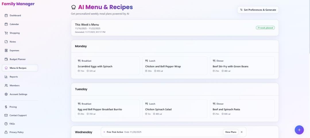 Family Manager is a unified household organization platform that simplifies family life. It combines calendars, shopping lists, expenses, budgeting, notes, recipes, messages, and AI-powered planning tools into one intelligent interface. The platform helps families reduce mental load, stay coordinated, and manage home operations with ease.