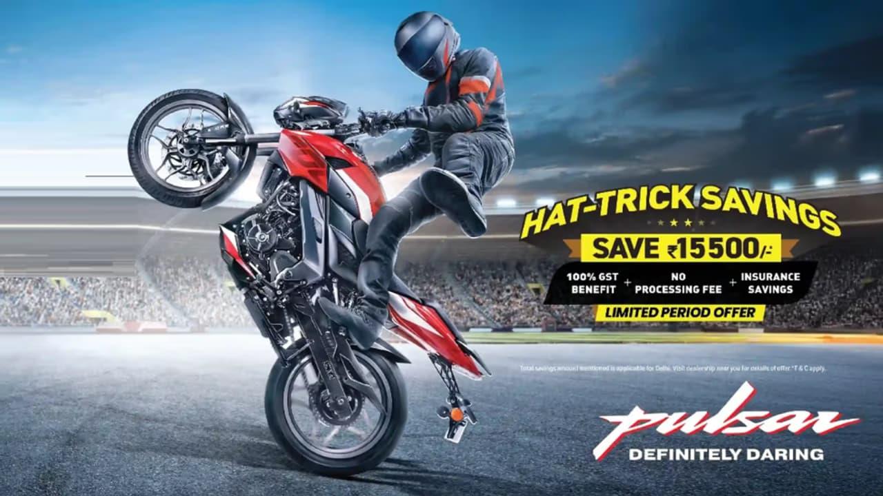Bajaj Auto has once again extended its popular Pulsar Hattrick Offer nationwide. Under this offer, customers get several benefits like GST reduction, zero processing fees, and insurance discounts.