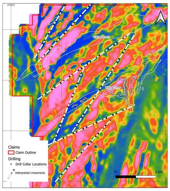 Resource Expansion Potential (Connecting the Zones) The high-resolution magnetic data suggests that historically fragmented zones - specifically in the Viking-Thor-Asgard confluence - where drilling to date has not tested the structures fully, nor tested where they appear to coalesce,have excellent expansion potential.- Structural Continuity: The survey reveals magnetic lows consistent with faults and other structural breaks, delineating these known zones and then connecting to the NE, where limited drilling has not transected the interpreted structures sufficiently. This implies that the mineralization identified in historic drilling may extend and has the opportunity to test additional, previously undrilled and unidentified secondary structures.