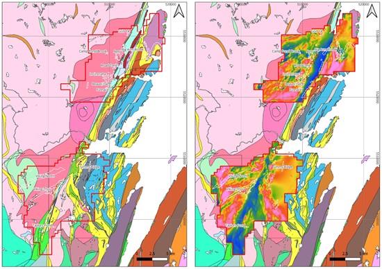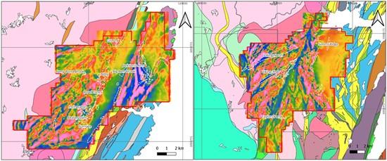 Figures 1.a (left) Provincial Geology (GSC Maps 156, 159, 160) and property showings and 1.b (right) Total magnetic intensity grid from 2025 Geotech Airborne Survey.