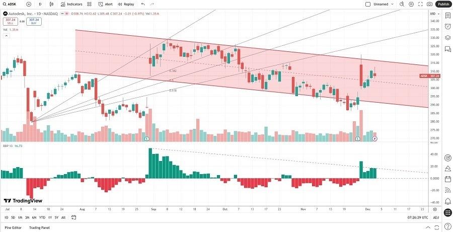 - The ADSK D1 chart shows price action inside a bearish price channel. It also shows price action below its ascending Fibonacci Retracement Fan. The Bull Bear Power Indicator is bullish with a descending trendline. The average bearish trading volumes are higher than the average bullish trading volumes. ADSK advanced less than the NASDAQ 100 Index, a bearish confirmation.