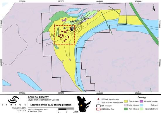 The 2025 drilling results outline a new mineralization context on the Aquilon project, characterized by a few high-grade gold intervals surrounded by a lower-grade but broadly distributed halo within a large rock volume. Sirios has initiated a review of lithogeochemical data and metallogenic models applicable to Aquilon.