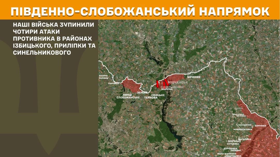 In the Southern Slobozhanshchyna sector, Ukrainian forces repelled four enemy attacks near Izbytske, Prylipky, and Synelnykove.