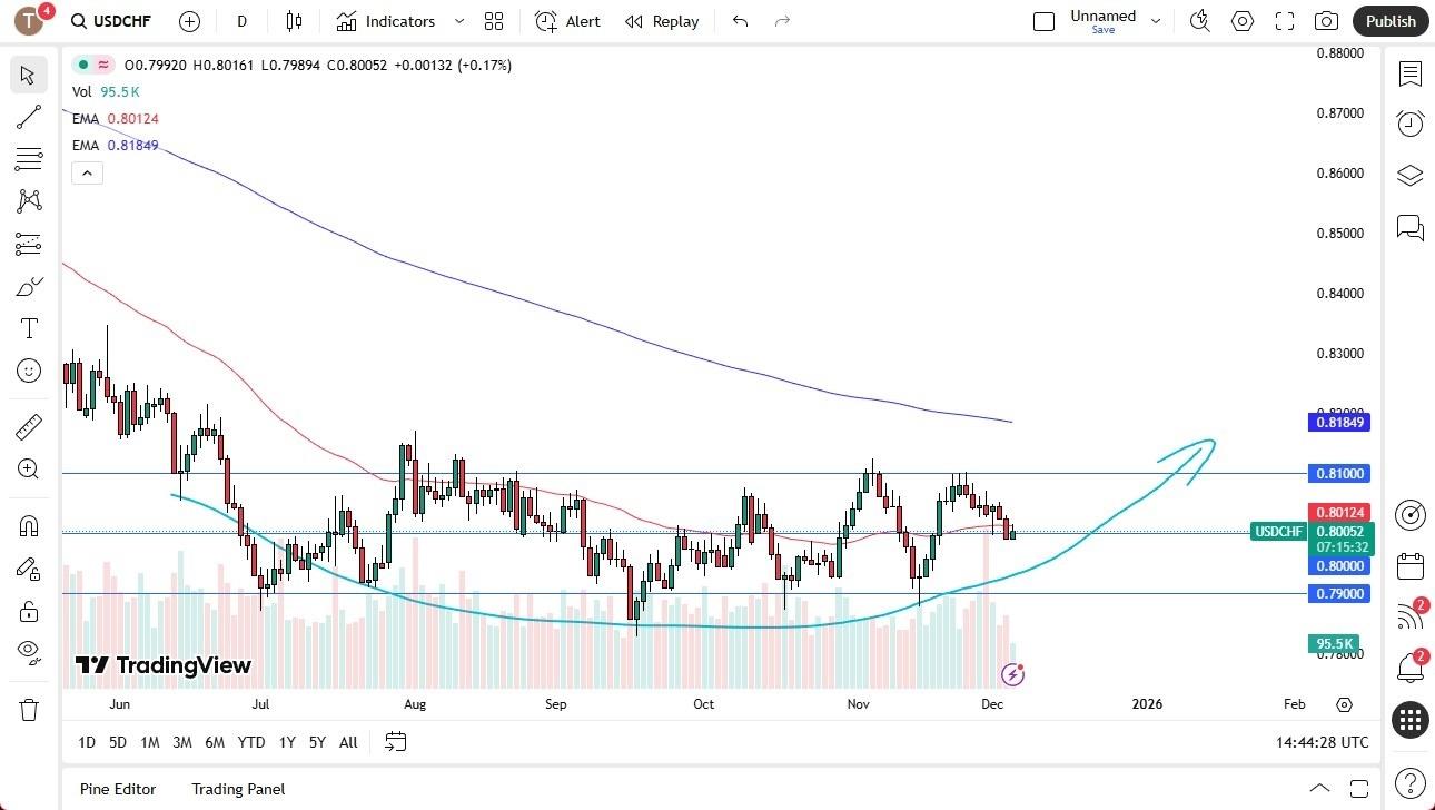 - USD/CHF holds firm as the 0.80 area provides structural support while the pair trades within a broader 0.79–0.81 range. Market focus turns to next week's expected Federal Reserve rate cut and the Swiss National Bank's sensitivity to franc strength.